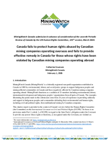 This Shadow Report to the United Nations Human Rights Committee with Respect to the Seventh Periodic Report of Canada was developed by the Environmental Justice and Sustainability Clinic, a public interest legal clinic and experiential education initiative housed at Osgoode Hall Law School in Toronto, and co-submitted with MiningWatch Canada and Legal Advocates for Nature's Defence (LAND).