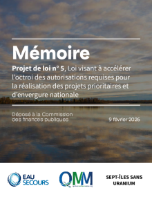 The purpose of this brief is to present an analysis of the proposed Bill to accelerate authorizations required for the completion of priority and national-scale projects (PL5). The brief was produced by Eau Secours, with the support of the Coalition Québec meilleure mine (QMM) and Sept-Îles Sans Uranium (SISUR), and aims to convey our comments and positions regarding the proposed legislation.