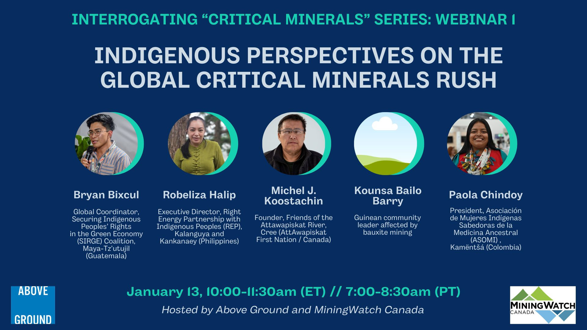 This webinar brings together five Indigenous speakers from around the world to discuss global, regional and local fights for justice related to the global push for critical minerals extraction. Panelists will discuss specific harms and rights violations they are facing, what a “just” energy transition might look like, and what civil society groups working on related issues should know.